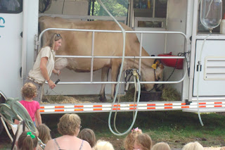 Meeting "Farmer Jason" at the Hoover Library....James and Beau are cracking me up with their expressions! This is Coco the Cow from the Trussville Library...This started at 9 am or so and was sooooo hot! This is Coco "spraying" the audience some fresh milk from her udders...Lovely!
